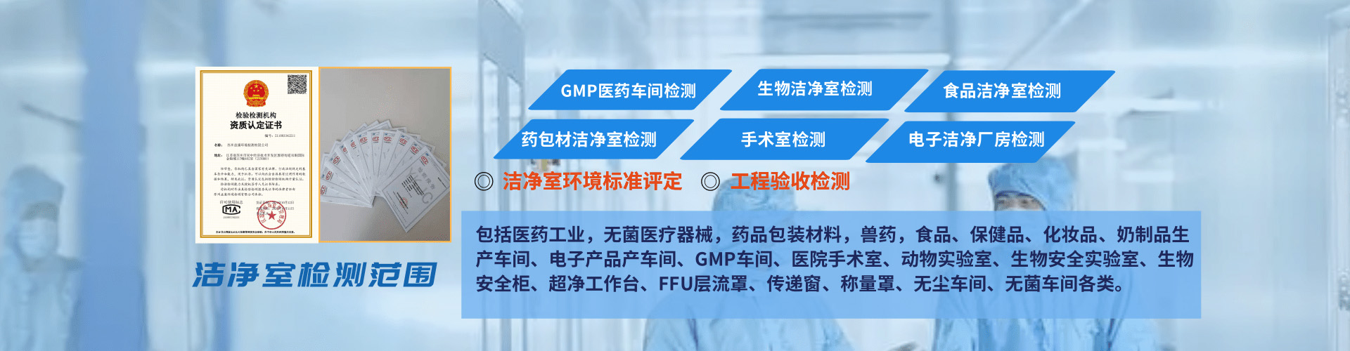 主營業務:凈化車間檢測 三方潔凈室檢測 計算機化系統驗證 潔凈室檢測 gsp溫濕度驗證 高效過濾器檢測 壓縮空氣檢測  純化水檢測 潔凈度檢測